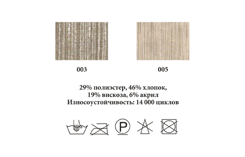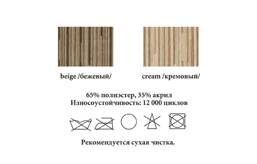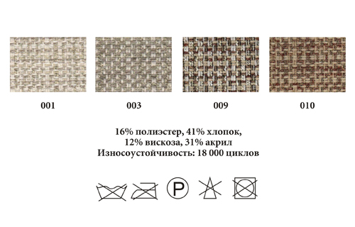 Ткань имеет настолько оригинальную фактуру, что возникает желание подойти и прикоснуться к ней. Надежность и практичность этой ткани видна с первого взгляда и действительно она обладает прекрасными техническими характеристиками, что обуславливает свободу эксплуатации и долговечность. Ткань прекрасно подчеркивает геометрические формы прямых моделей и может рекомендоваться для кроватей с навесными подушками. Компаньоном к ней может послужить как кожа, подобранная в тон, так и текстиль с мелкой фактурой.